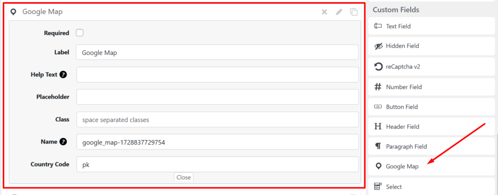 The Country Code field is used to narrow down the geographical search scope of the Google Map. In this example, “pk” is entered, which stands for Pakistan. This can be adjusted based on the form’s requirements. For example, setting a country code ensures that the map focuses on a specific region, reducing ambiguity for users when they input their location.