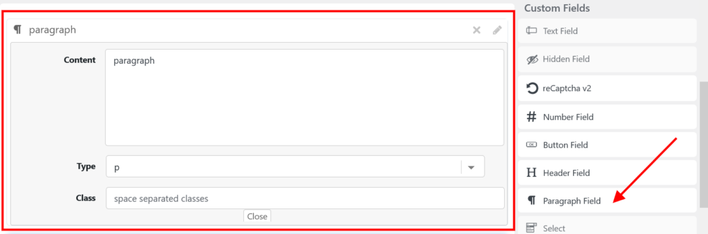 Select the field from the right side, then fill in the fields as needed. This field will not save in the meta, only will be show at front-end form.