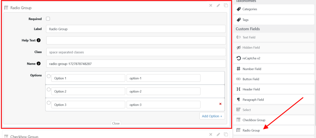 Select the field from the right side, then fill in the fields as needed. This field will be saved in the meta, and the meta key will be the ‘Name’ field.