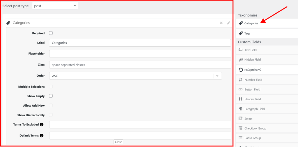 In Taxonomies you will see list for taxonomies (category, tags …) related the post type you selected in the top. If now taxonomies related to the post then that type of fields will be hidden.