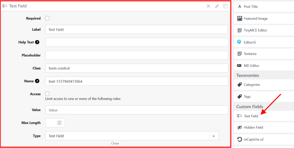 Select the field from the right side, then fill in the fields as needed. This field will save in the meta, and the meta key will be the “Name” field.