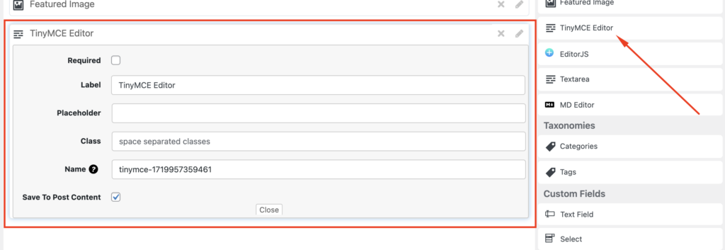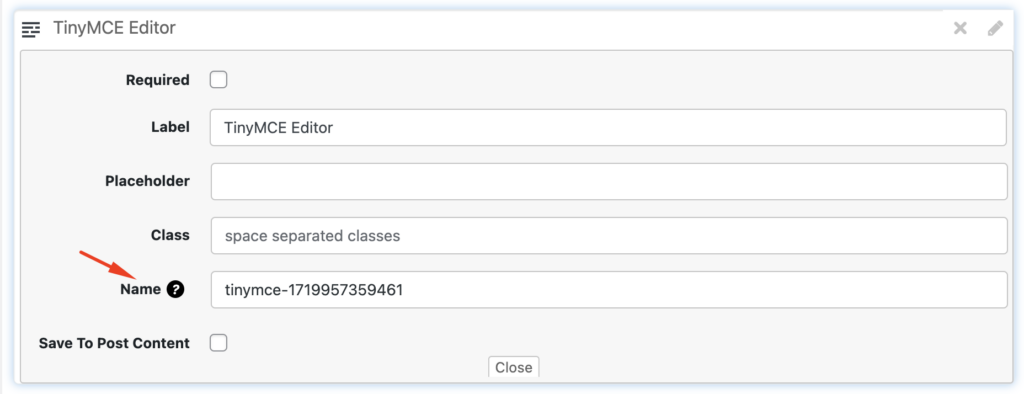 If selected Save To Post Content then the content of the form will be saved into post content if not it will be saved into post meta with the name in the Name input