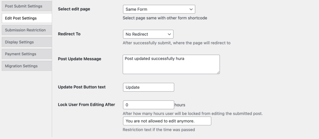 - Set the page where users will be redirected after successfully updating their posts.