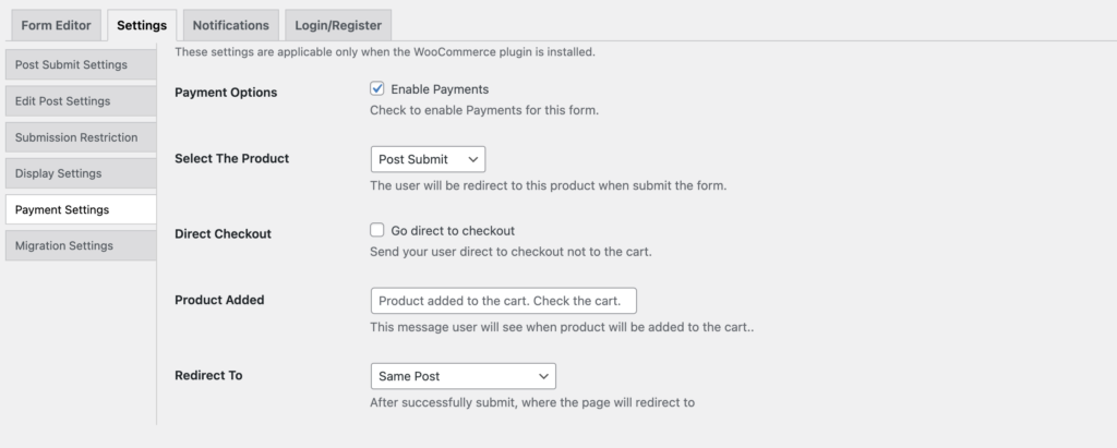 - Enable Payments: Check this box to enable payment processing for this form. When enabled, users will not be able to publish their posts until payment is completed.