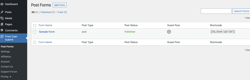 – Front User Submit Form with shortcode [ fe_form id=”form_id” ] with slug your-site/front-user-submit-form/