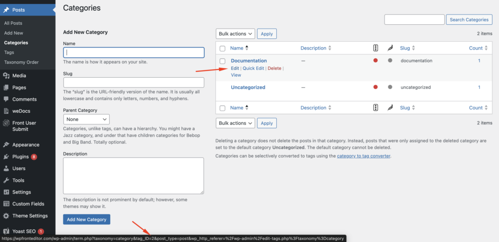 - When viewing the list of terms under Categories, Tags, or any custom taxonomy, hover over the term name.